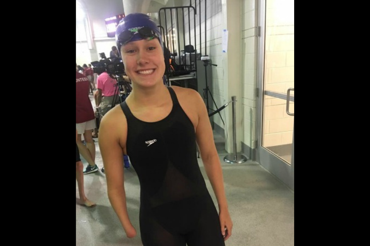 Paralympic competition is sorted into classifications that reflect the level of able-bodiedness of the athlete in physical and technical tests. Natalie is categorized in the S9 division, as she is limb-deficient in her right forearm. She still swims faster than most athletes on the Otters swim team, and has met National “A” cuts with USA Swimming and the Emerging Athlete team cuts for US Paralympics. This means she’s been invited to camps at the US Olympic Training center and also competed for Team USA at last summer’s Toronto Para Pan-am Games.